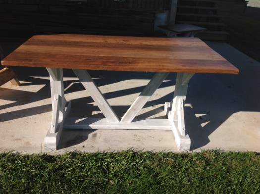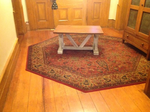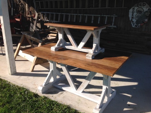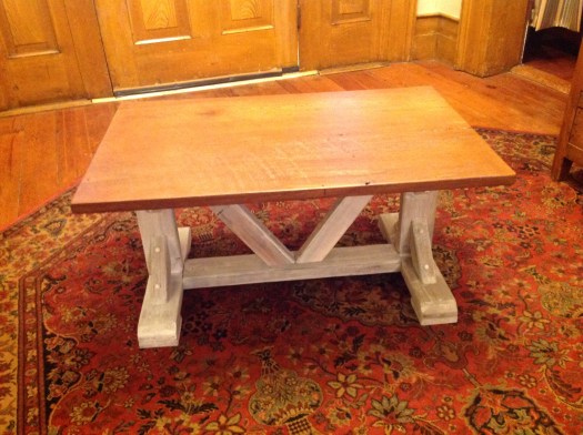 Per request, the Middlebreeze Manufactory has been busy making tables in the farmhouse style. The first one, a coffee table, is finished and ready for pickup by the client. Hubby likes it so much, he wants to keep it…!