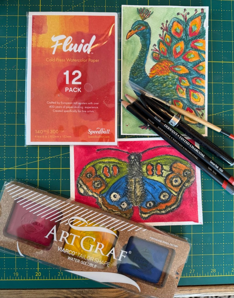 Who knew (obviously not me) that tailor’s chalk came in different colors, and could be used this way. Yes, I’ve been behind the door on this one, and thoroughly enjoying creating this way. The Derwent Tinted charcoal pencils were also new to me…but then most of what SketchBox sends me are unique.