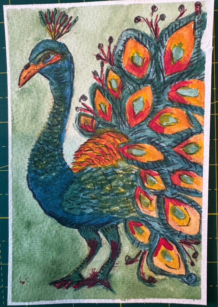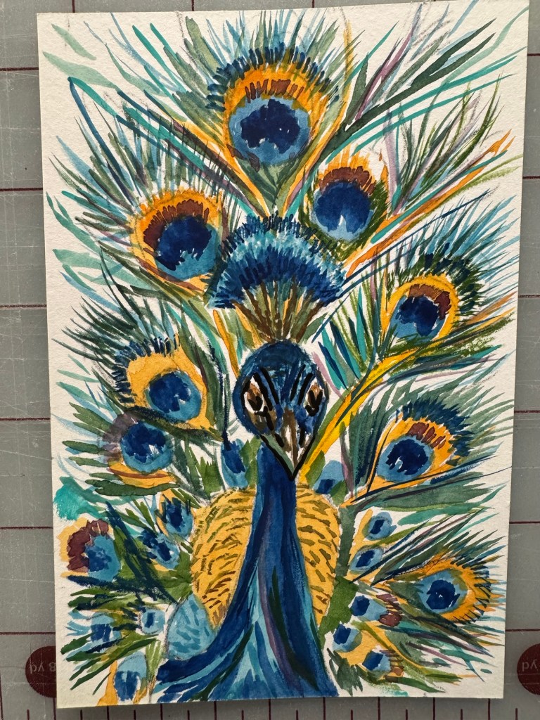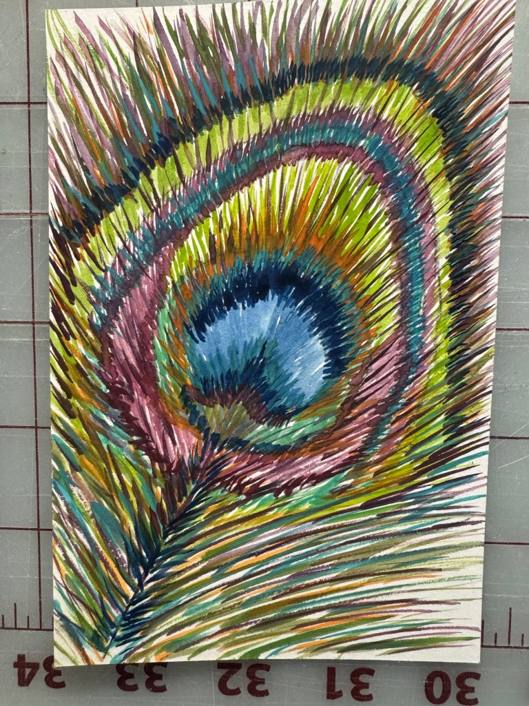 Prompt for this month is “peacock”, and oh how I love a good peacock. And the gouache colors were perfect for mixing to obtain the brilliant colors in a peacock. I’ll be the first to admit that I’m really not good at color mixing, but the tutorials that accompany the monthly SketchBox boxes are very informative, so I had pretty good luck with that, and took notes and what I did. See…you can teach an old dawg new tricks! And I paid attention, which usually helps – ha!