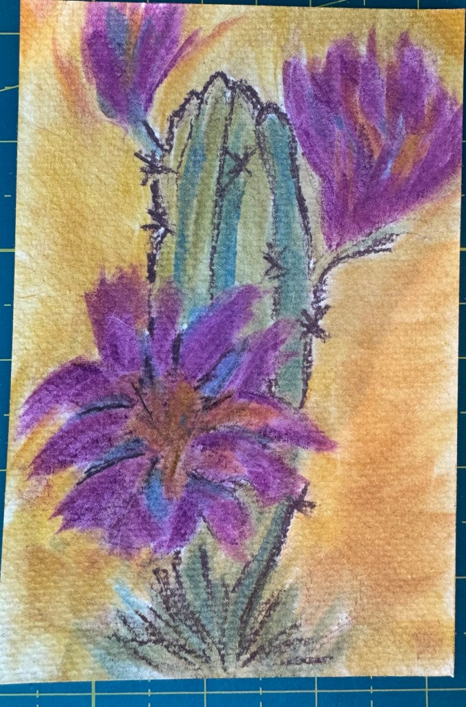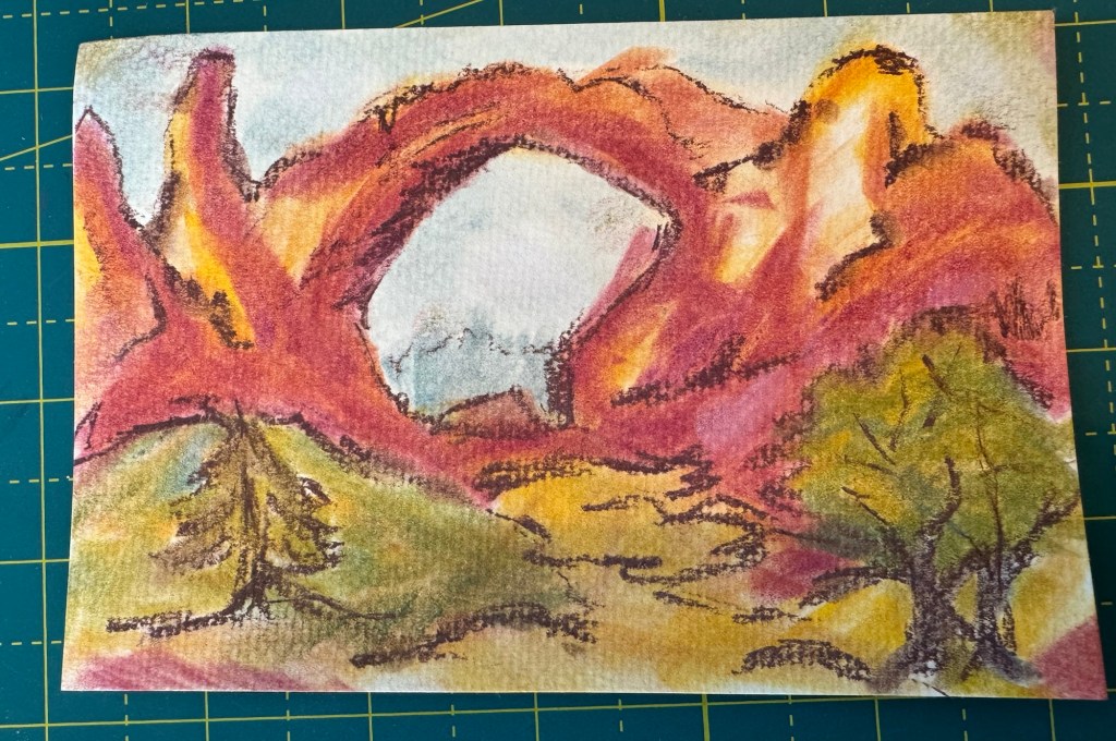 As usual, pastels, and in particular, pan pastels, are a novelty for me, but have to say I might be getting the hang of it. The prompt for this month was “desert”, and the colors of the pan pastels were perfect! Had so much fun that I tied 3 different scenes or themes.