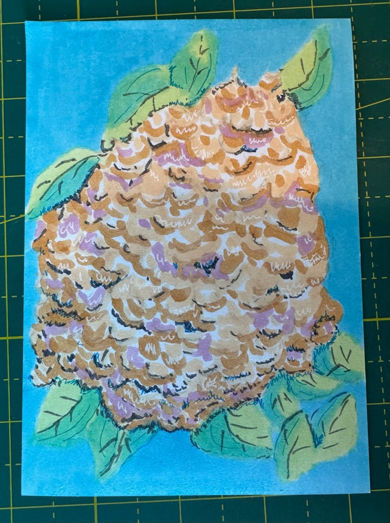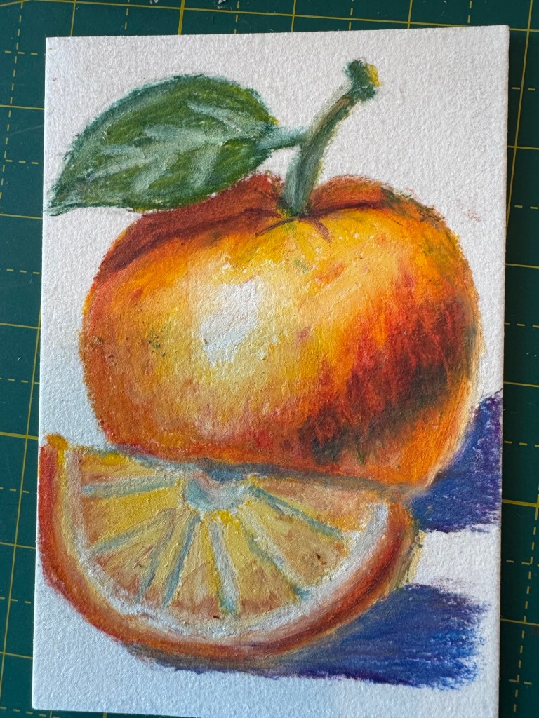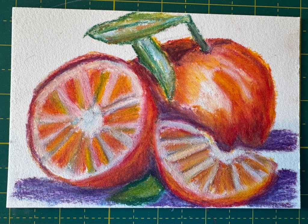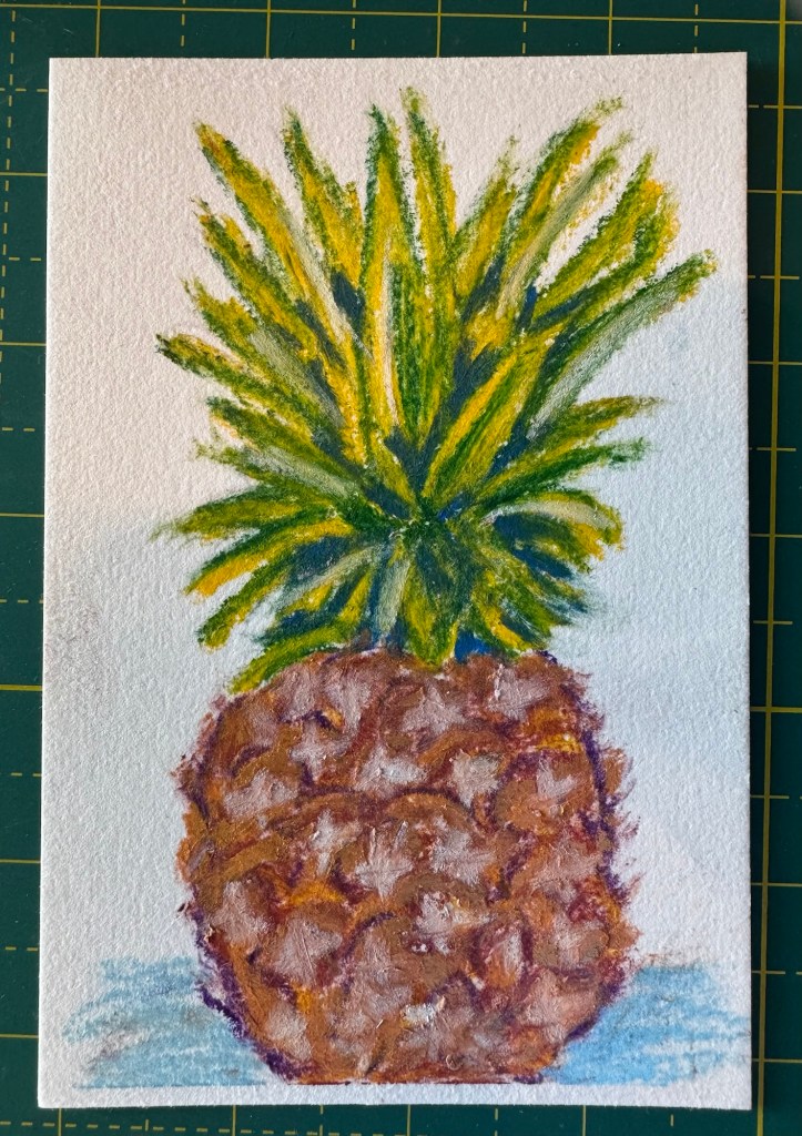 Love, love the consistency of oil pastels and the colors they bring. The prompt for this moth was “fresh fruit”, and I got a little hung up on oranges, so tried a pineapple, too.