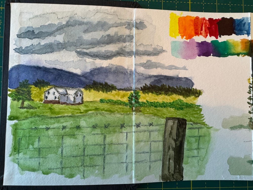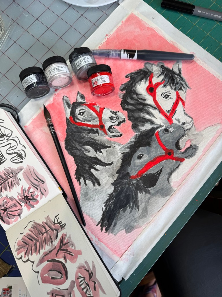 The small travel sketchbook/watercolor included was a little small for me to work with, and couldn’t accommodate my horses, so I used another sheet of paper. I like the watercolor sketchbook, but I’m older, and it just cramped me up to try to go so small. Loved the inks, and ink brush, although I experienced a few big ink blobs! And one in the middle of my horses…you “love and learn” as my mama used to say, so I had to do damage control.