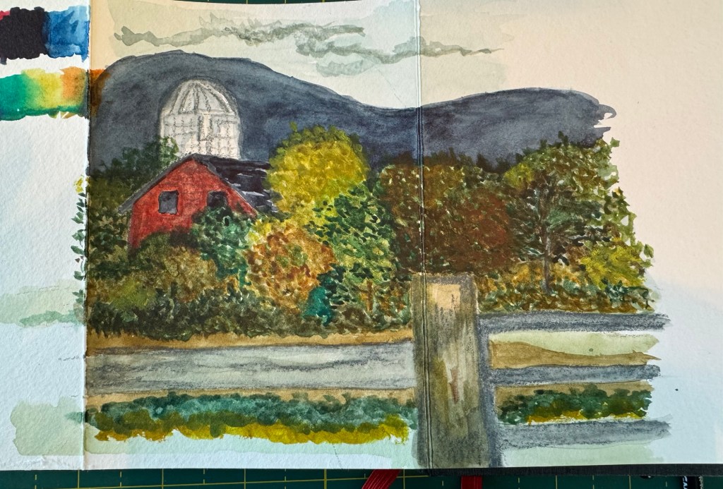 The Pickle House was very quickly done, basically freehand pen and ink SketchBox with a little watercolor. It’s called the pickle house because of its olive green color. It was given as a gift to the owner for letting folks stay in the house 0ne weekend. Particularly loved the whimsy of the old metal chairs on the right hand side.