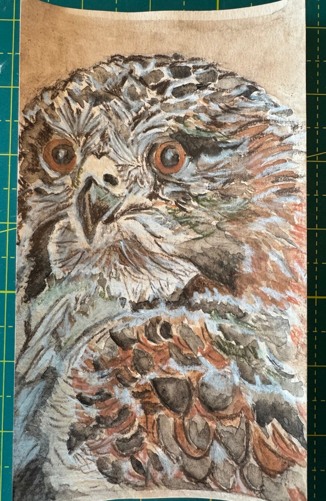 This was done mixing the above colors, and using the short tip end of the brush in light short and long strokes. I was going for a more feathery look. Whaddya think? 😁