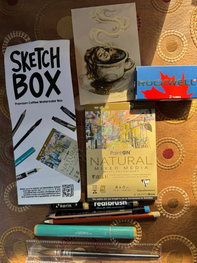 And leave it up to SketchBox to send me another novelty…watercolors derived from coffee…two different colors, and they smelled so good while using them. I don’t drink coffee, but I do love the smell.