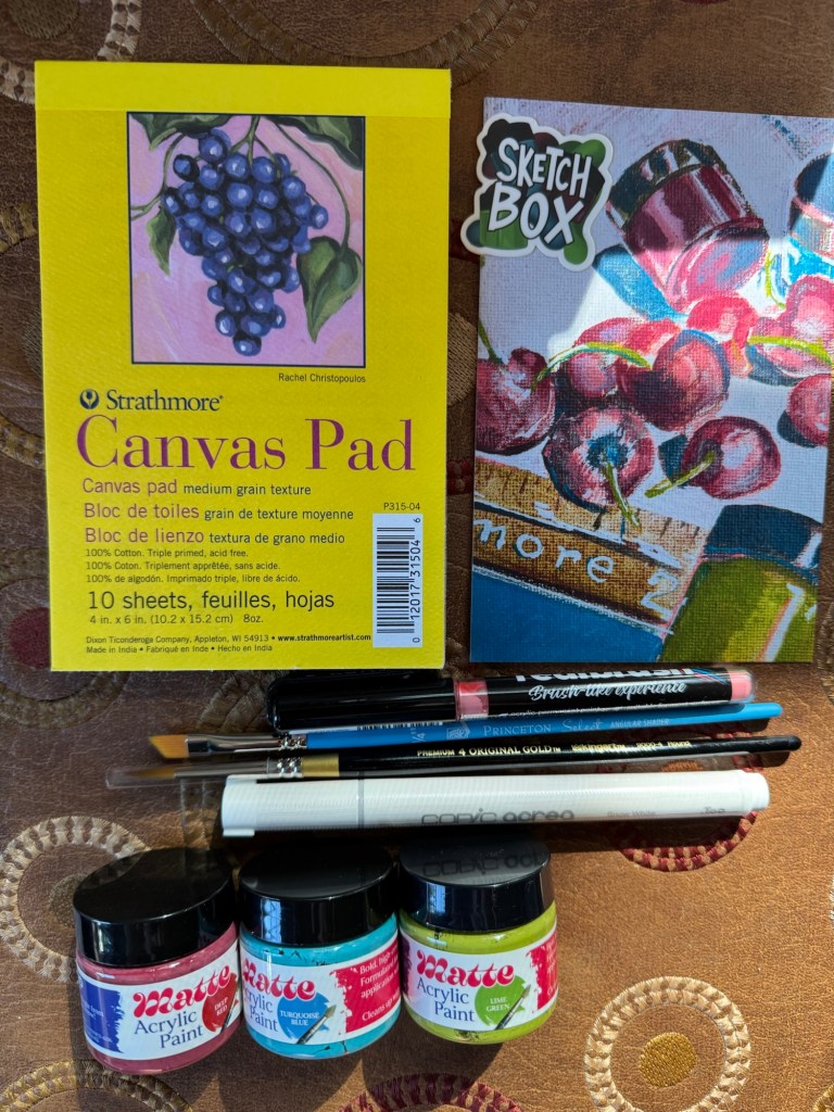 Can you say acrylics…??? That’s what the April monthly box had in it, complete with paint, brushes, and canvas pad!