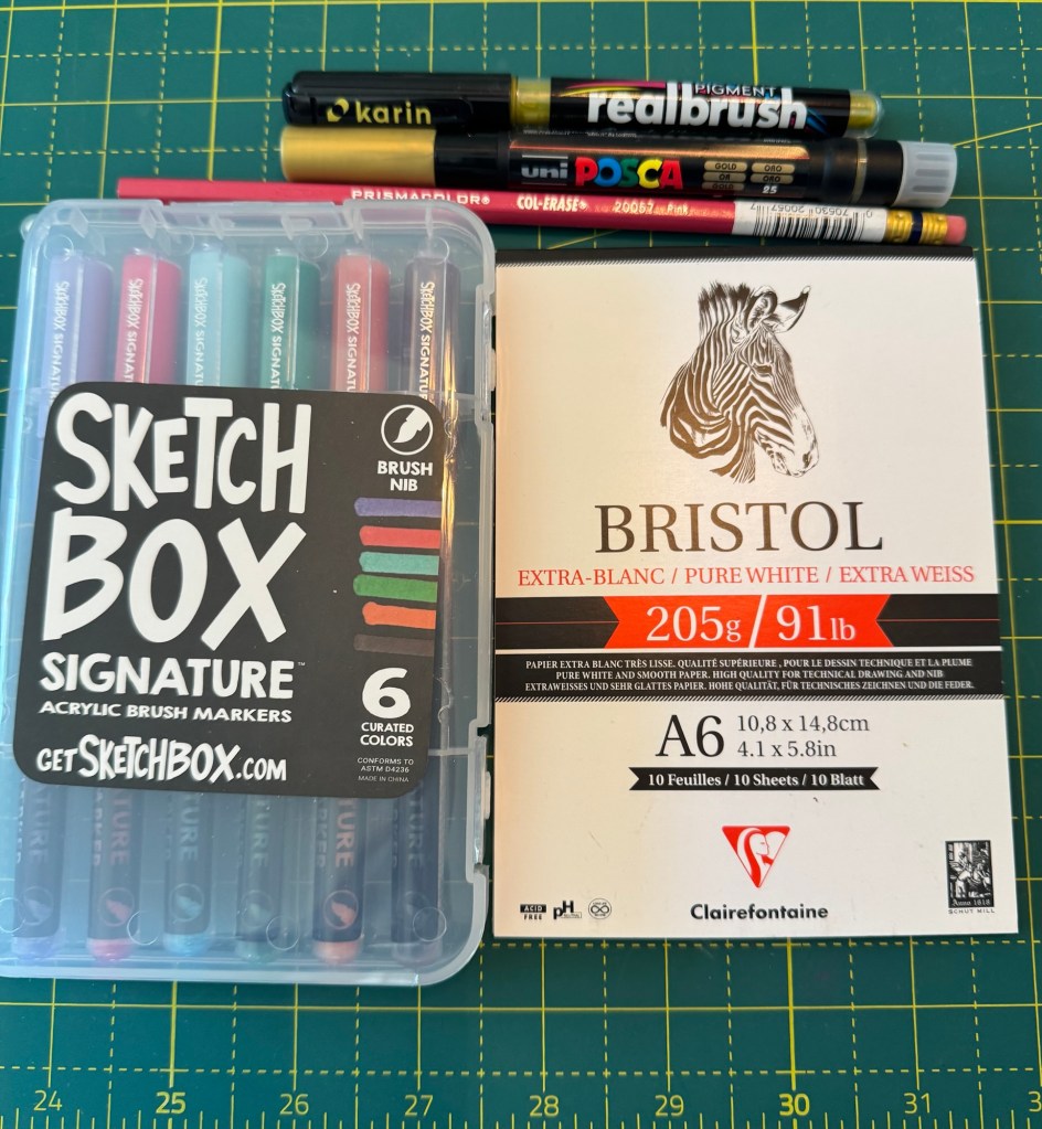 Lots of fun things in this box, and as always, items I haven’t used much (I repeat…I’m a watercolor, and pen and ink girl). But I enjoy everything @getSketchBox sends. Some are more challenging than others, like these acrylics. They dry so fast, and I need lots of practice in mixing them because I make LOTS of mud colors when I mix paint. The brushes and real brush marker were very complimentary for this box.