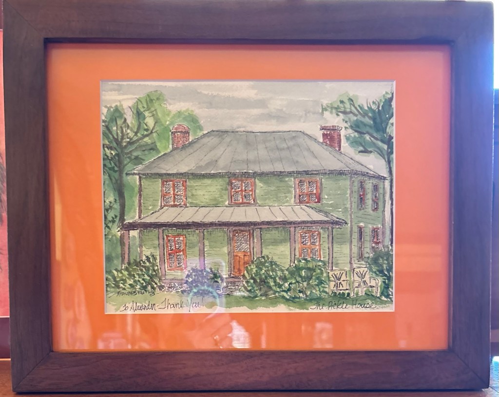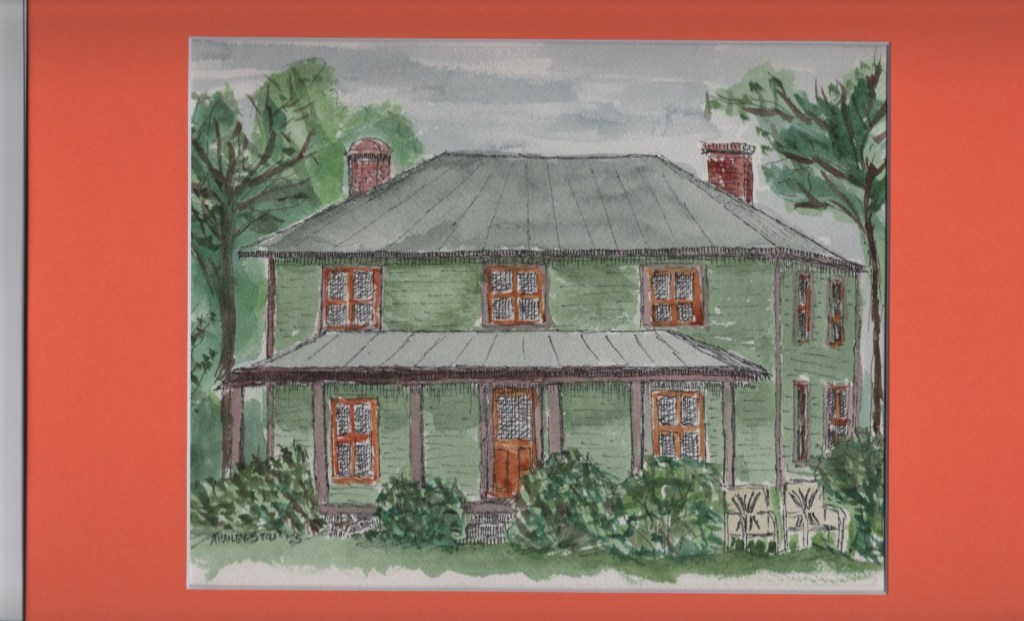 The house is called “the Pickle House” because of it;s rich green-olive color, and accented in a burnt orange. As always, my husband made the frame, a beautiful walnut. We chose an orange colored mat to complement the trim on the house. And I just loved the old rust yellow chairs just to the right of the porch in the yard.